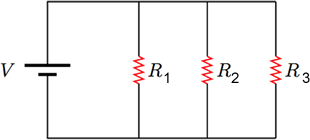 A figura abaixo representa um circuito elétrico com três resistores idênticos, de resistência \( R \), ligados a uma fonte ideal de força eletromotriz \( V \). (Considere desprezível a resistência elétrica dos fios de ligação.)