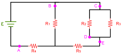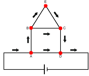 Os pontos A, B, C, D e E da figura abaixo estão ligados por fios condutores metálicos de igual comprimento e espessura, feitos do mesmo material, constituindo, cada um, uma resistência não desprezível. O circuito principal é percorrido por uma corrente contínua \( I \).