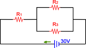 No circuito representado na figura abaixo, a fonte tem força eletromotriz de 30 V e resistência interna desprezível. Os resistores têm resistências \( R_1 = 20 \, \Omega \) e \( R_2 = R_3 = 60 \, \Omega \).