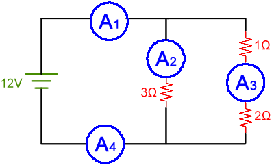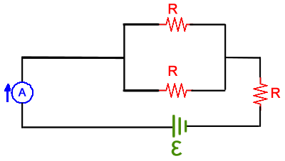 Nessa situação, a leitura do amperímetro \( A \) apresenta, em ampères,