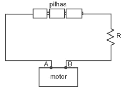 O circuito a seguir representa três pilhas ideais de 1,5 V cada uma, um resistor \( R \) de resistência elétrica 1,0 \( \Omega \) e um motor, todos ligados em série.