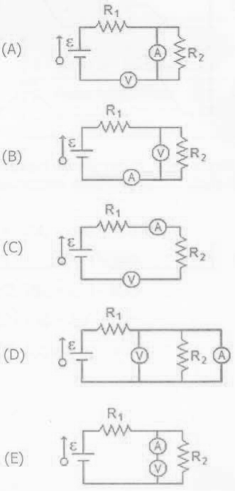 Assinale a figura que representa a correta conexão do voltímetro (V) e do amperímetro (A) ao circuito para a realização das medidas desejadas.
