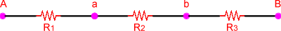No circuito, \( V_A = -20 \, V \) e \( V_B = 10 \, V \) são os potenciais nas extremidades \( A \) e \( B \); e \( R_1 = 2 \, k\Omega \), \( R_2 = 8 \, k\Omega \) e \( R_3 = 5 \, k\Omega \) são os valores das resistências elétricas presentes. Nessa situação, os potenciais nos pontos \( a \) e \( b \) são, respectivamente,