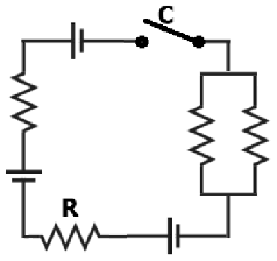 Com a chave C aberta, a corrente elétrica que passa pela resistência de \( 20 \, \Omega \) é de ..................; com a chave C fechada, a corrente elétrica que passa pela resistência de \( 20 \, \Omega \) é de .................. .