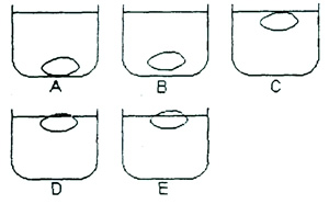 3. Um ovo colocado num recipiente com água vai até o fundo, onde fica apoiado, conforme a figura . Adicionando-se sal em várias concentrações, ele assume as posições indicadas nas outras figuras B, C, D e E .