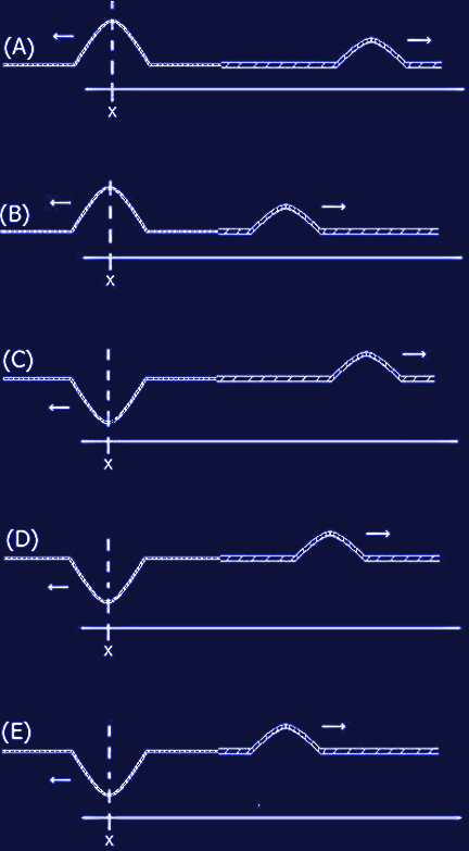 Assinale, entre as alternativas, aquela que melhor representa a corda quando o pulso refletido está passando pelo mesmo ponto \( x \) indicado no diagrama acima.