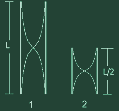 Na figura abaixo, estão representadas, esquematicamente, ondas sonoras estacionárias em dois tubos, 1 e 2, abertos em ambas as extremidades. Os comprimentos dos tubos 1 e 2 são, respectivamente, \( L \) e \( L/2 \).